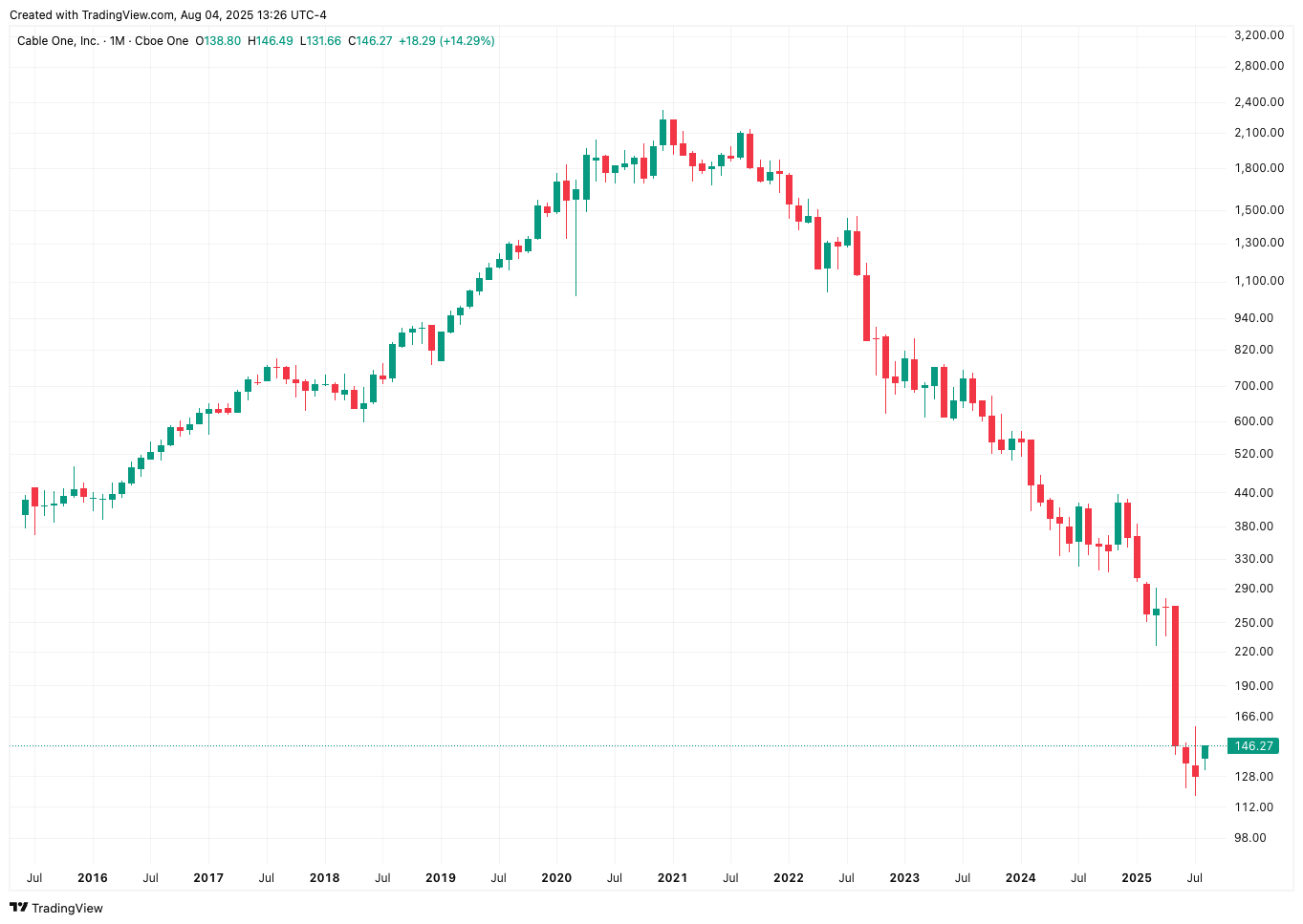 Cable One (CABO) is a rural/small-town cable company that was spun out of the Graham Holding Company (GHC) in 2015. Initially priced at $400/share, CABO went straight up for the first six years of its public life. It peaked in 2021, just shy of a six-bagger, due to its differentiated strategy and good operating by management. Poor capital allocation decisions during the ZIRP-era resulted in a precarious balance sheet situation. Combined with the general disfavor shown to the cable/telecom industry as of late, the stock has spent the last four years completing a portrait of Mount Doom.