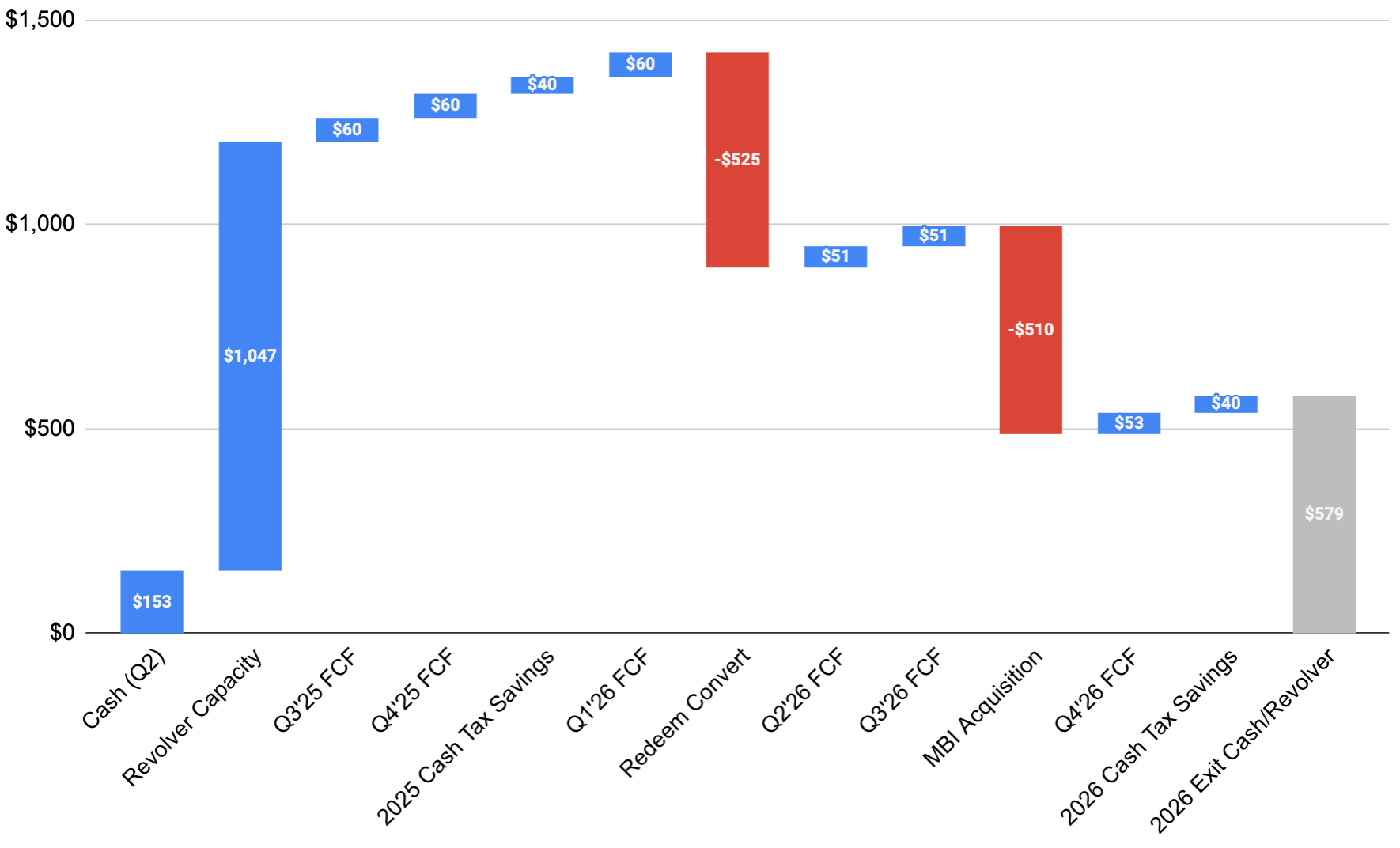 Speaking of FCF, annualizing off H1, 2025 figures (which are a bit pessimistic due to working-capital changes), the company should generate ~$60M/quarter of FCF, with five quarters until the MBI put closes, giving $300M in additional cash.